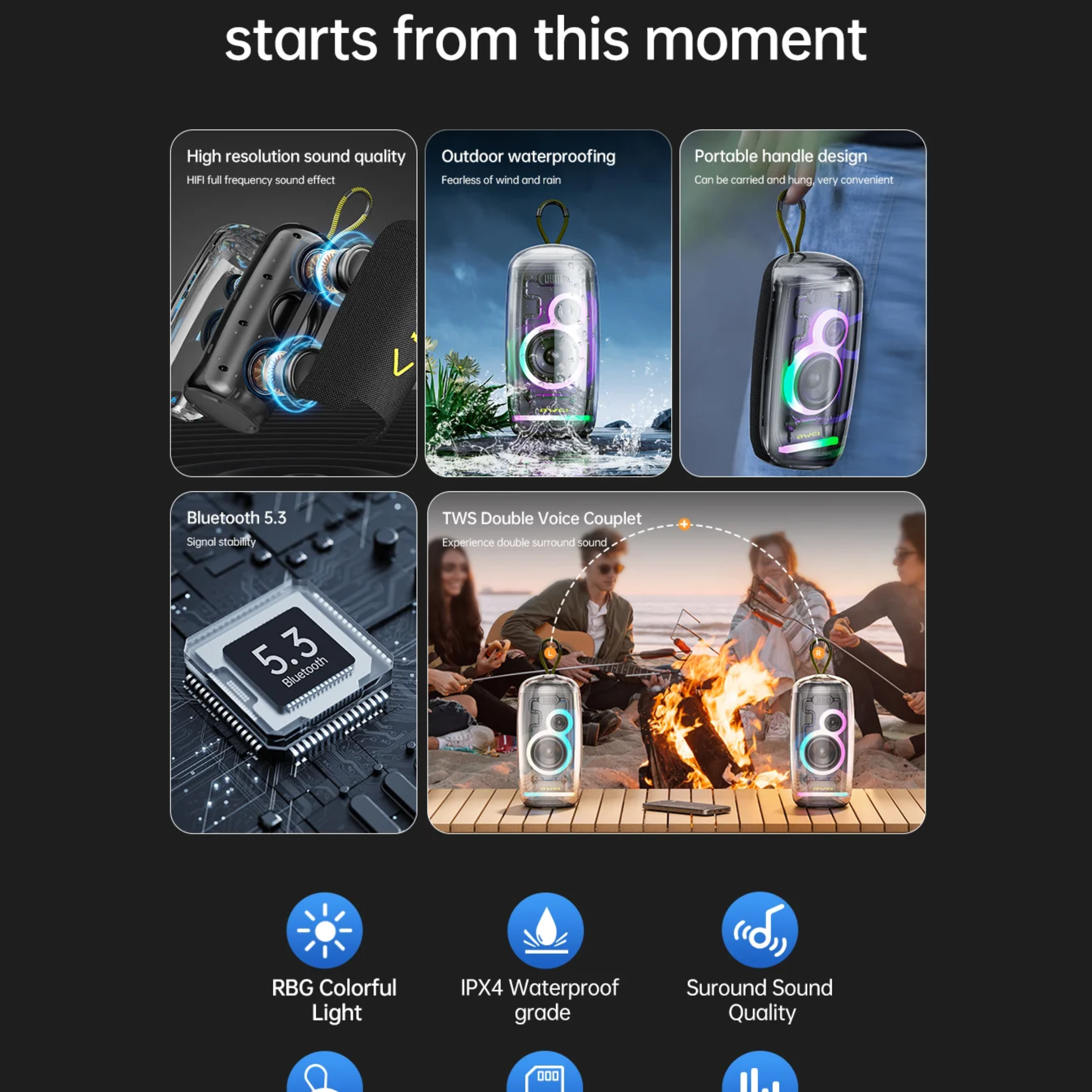 AWEI KA32 Waterproof Bluetooth Speaker TWS Pairing Music Player Subwoofer with Colorful Light Advanced Bluetooth 5.0: Stay connected with Bluetooth 5.0 technology, which provides a stable connection to your devices, including smartphones and computers. Ensures minimal interference from other signals, maintaining a clear and consistent audio streamSeamless TWS Pairing: Experience the convenience of True Wireless Stereo (TWS) pairing with this Bluetooth speaker. You can connect two speakers simultaneously for a more immersive audio experienceWaterproof Design: IPX4 rating, protects the speaker against liquids, waterproof to splash, and rain, gentle spray, no need to worry when using it at parties, pool and the beach, while camping or hiking, and moreColorful Lighting: This speaker offers eye-catching light, bringing joy and delight to your lifeSuitable Scenes: Perfect for outdoor cycling, motorcycling, hiking, camping, and moreSpecification:Bluetooth version: V5.3 JLAC6966BSupported Bluetooth protocols: A2DP/AVCTP/AVDTP/AVRCP/HFP/HID/RFCOMM/SPP/SDP/L2CAP/PNPChannel system: dual speakers + diaphragmMaximum power: 10W*2Speaker: 52*52mm/4ΩBattery: 2400mAh lithium batteryCharging time: 3-4 hoursMusic time: 4-5 hours (70% volume)Waterproof level: IPX4Product weight: 860g (including lithium battery)Dimensions: 210*106*106mmBluetooth effective distance: 10mFrequency response: 60Hz~18KHzCharging input standard: Type-C DC 5V 500mAPackage included:1 x Speaker1 x English User Manual1 x USB CableOther things not included
