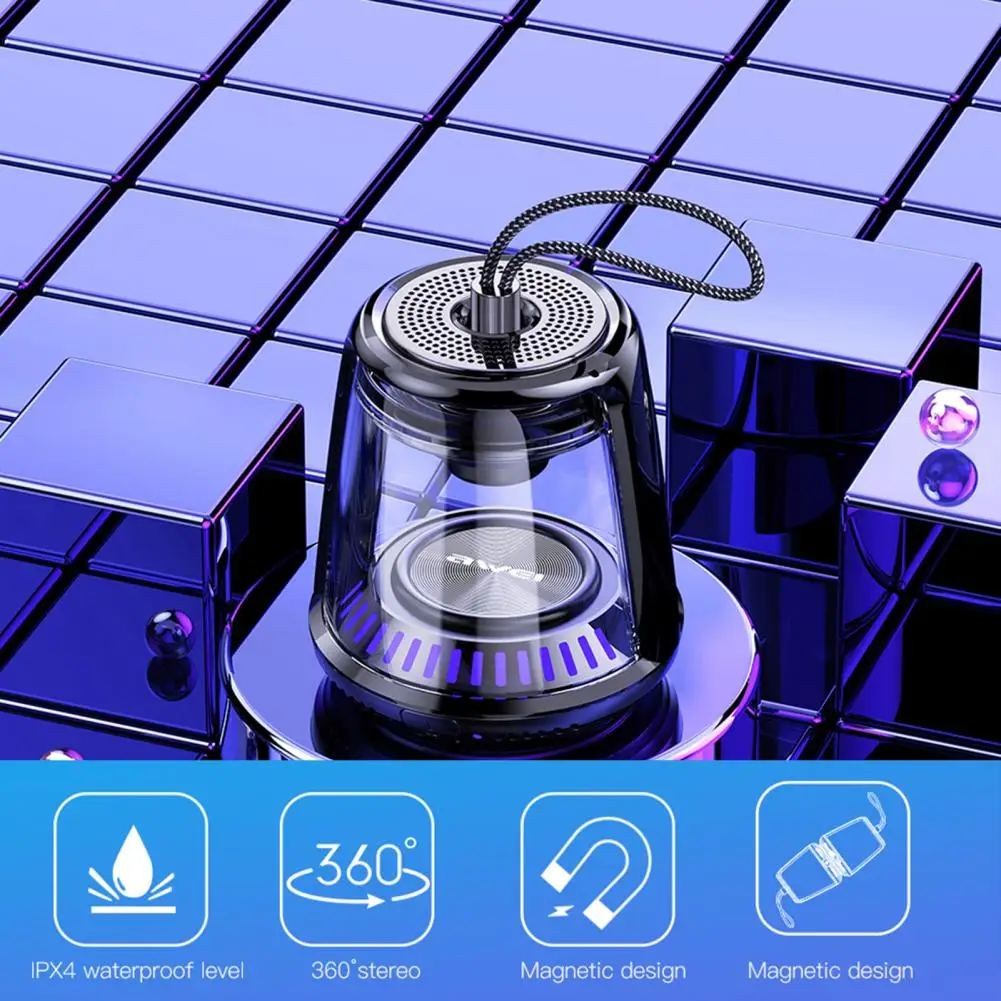 Bluetooth 5.0 ensures instant pairing, and has faster connection speeds, more stable signal transmission and lower power consumption. Built-in 800mAh battery and energy-saving circuit, the Bluetooth speaker can play for 6 hours after fully charged. 16 million lampwicks, the speaker has cool lighting effects.The speaker features IPX6 waterproof, magnetic base.360 degree surround sound can be realized by using two sets at the same time to offer 6D stereo surround sound, bringing you more shocking sound quality. With lanyard, the speaker is very easy to carry and use. With APE/FLAC/MP3/WAV/WMV play modes, humanized design meet the needs of different people.Made of high quality PC material, the Bluetooth speaker is durable and portable.The length of Bluetooth speaker is 9.4cm, and the width of Bluetooth speaker is 7.8cm, and the height of Bluetooth speaker is 5.8cm.It is suitable for outdoor activities, travel, party, etc.Six Month WarrentyItem Name: Bluetooth SpeakerMaterial:PCPower Supply: Built-in Battery (Included)Charging Time: 1.5hRated Power: 5WSensitivity: (TYP)Battery Capacity: 800mAh/3.7VWaterproof Grade: IPX6Impedance: 4ΩTransmission Distance: 10M (without Barrier)Bluetooth Version: V5.0Music Time: 4-6hTalk Time: 4-8h