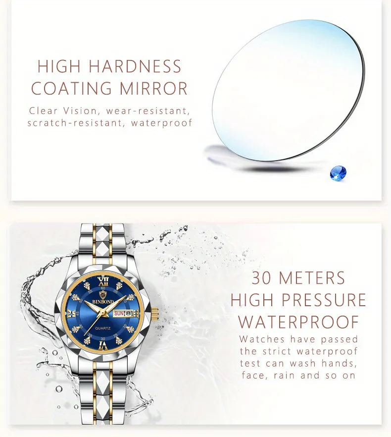 Binbond Luxury Fashion Couple Watch Set – Sport Quartz with Week & DateCelebrate harmony and style with the Binbond Luxury Fashion Couple Watch Set, a thoughtfully designed pair combining sporty elegance with calendar functionality. This matching set is ideal for couples who value synchronized aesthetics and practical performance.Key FeaturesCoordinated Couple DesignFeaturing matching aesthetics with smart proportions, this set includes one watch sized for women (approx. 28 mm dial) and one similarly styled for men—perfect for complementary styling.Multi-Function Time DisplayEach watch includes dedicated day-of-week and date displays, elegantly integrated into the dial for ease of use and a clean presentation.Reliable Quartz MovementQuartz-driven mechanisms ensure accurate and dependable timekeeping with minimal maintenance.Sporty Yet Elegant AestheticA polished metallic finish combined with refined details gives these watches a versatile look that transitions seamlessly from casual to business and evening wear.Water Resistance for Everyday LifeBuilt to resist water exposure up to 30 meters (3 ATM), these watches can endure splashes, brief hand washing, and light rain—making them suitable for daily wear.Durable Build with Comfort in MindAlloy cases, stainless steel bracelets, and an easy-to-adjust clasp provide both a robust feel and lasting comfort on the wrist.SpecificationsFeatureDetailsMovementQuartzFunctionsWeek-of-Days and Date DisplayWater Resistance3 ATM (30 meters)Case MaterialAlloyBracelet MaterialStainless SteelWomen’s Dial SizeApprox. 28 mmSet IncludesTwo Matching Watches (His & Hers) Why You’ll Love This SetElegant Couple Coordination: Ideal for partners looking to express unity through style.Function Meets Fashion: Week and date features add utility without cluttering the dial.Stylish Durability: A polished, sporty look with everyday resilience.Reliable Design: Quartz accuracy ensures on-time performance.Memorable Gift: A meaningful, stylish choice for anniversaries, engagements, or special celebrations.Rename your moments together with the Binbond Luxury Fashion Couple Watch Set—a blend of matched design, practical functionality, and lasting elegance.