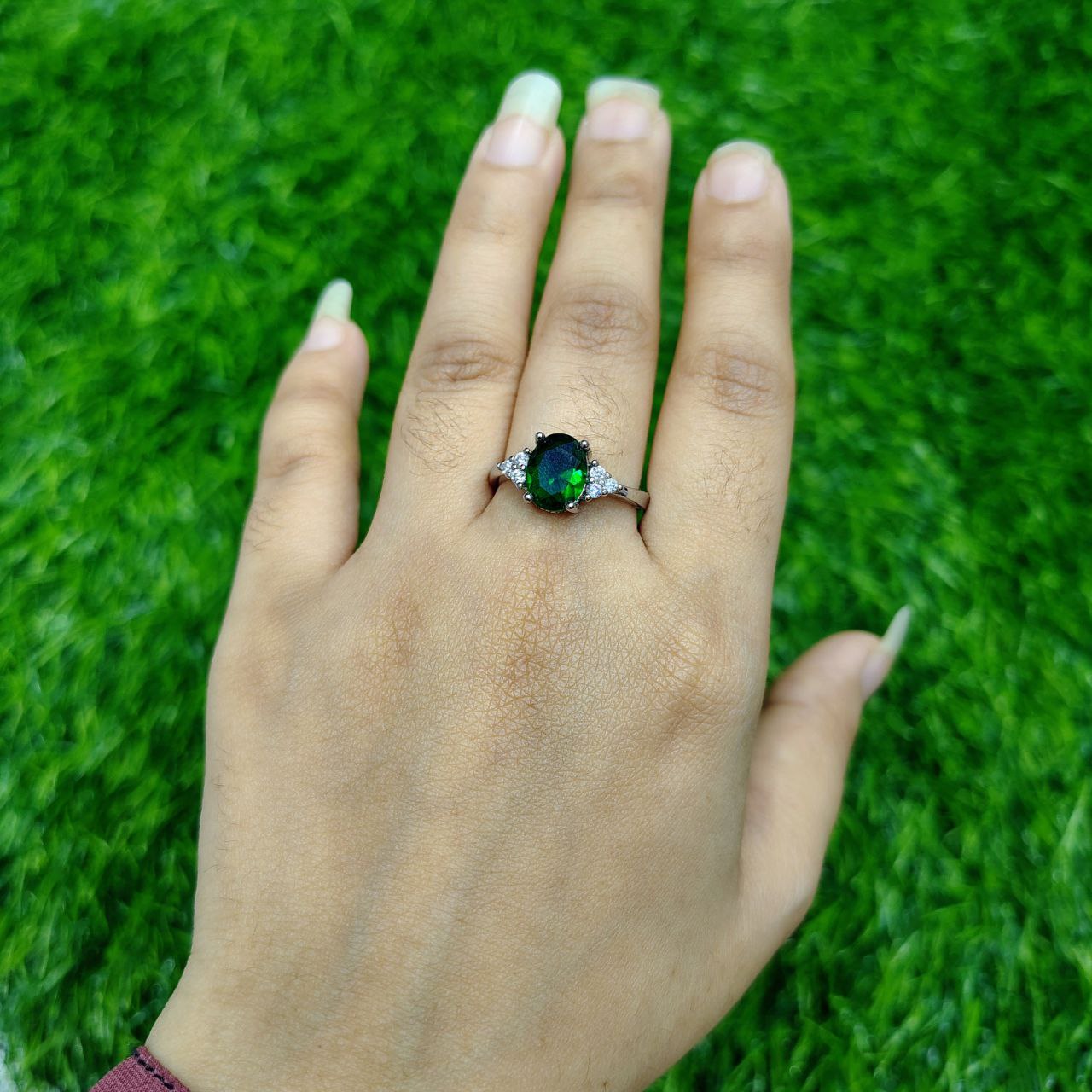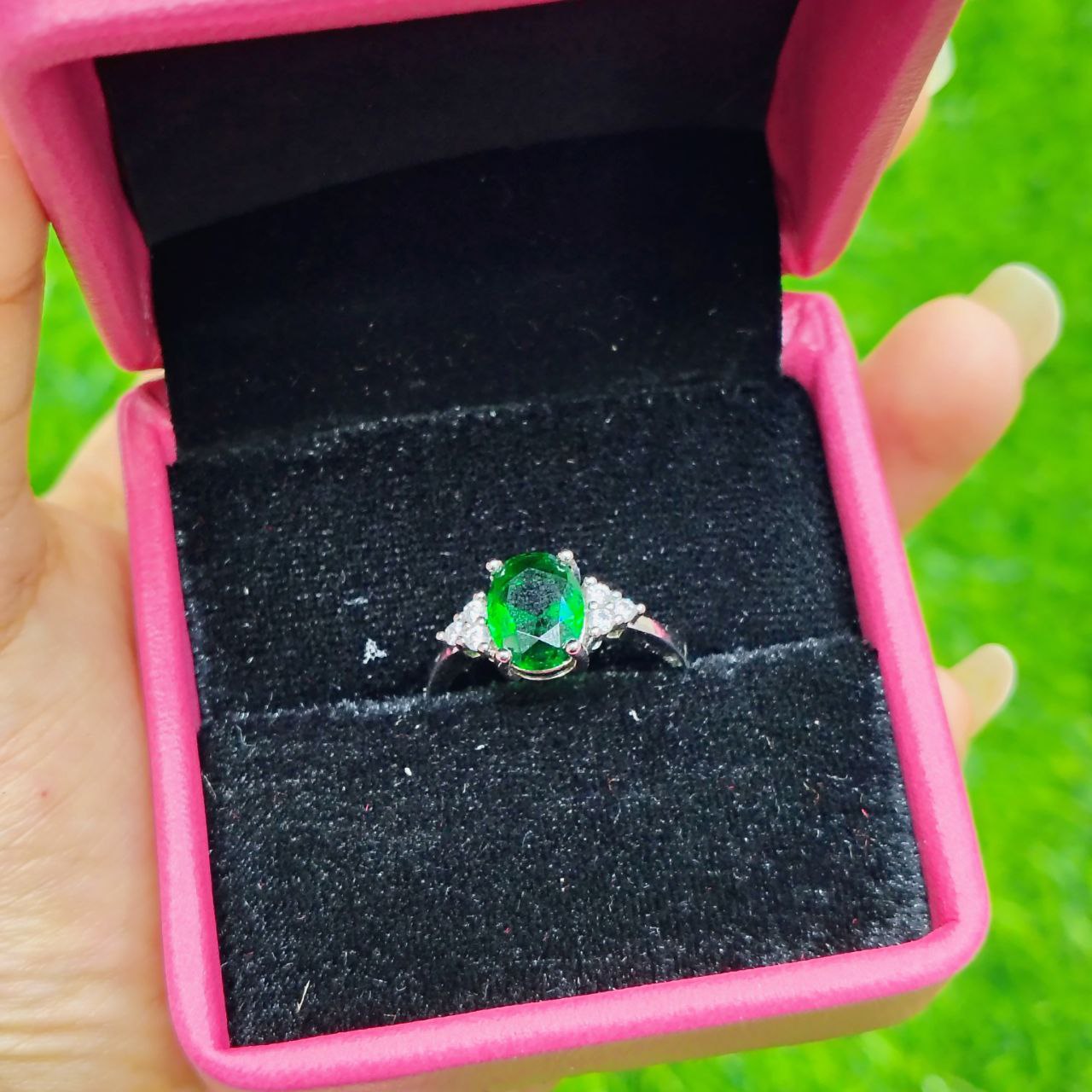 Emerald Shine Classic Ring   Add timeless elegance to your collection with the Emerald Shine Classic Ring. Featuring a deep green oval stone flanked by sparkling white crystals on each side, this ring is a perfect blend of charm and sophistication — ideal for special occasions or everyday luxury.