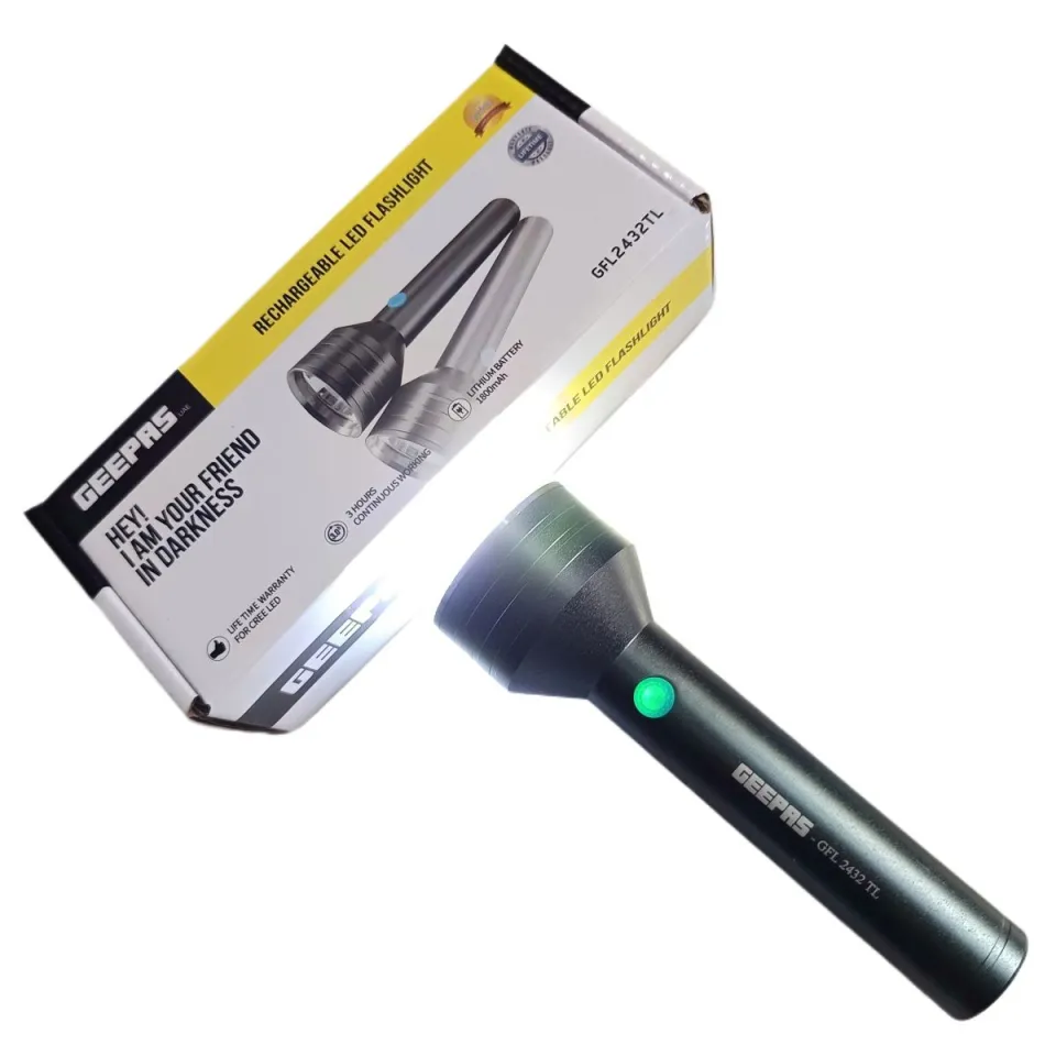 Product details of GEEPAS GFL-2432TL Metal Body 6.5 Inch 1800mAh Battery Rechargeable LED Flashlight / TorchlightHigh quality battery can be charged up to 1500 times.Machined aircraft grade aluminium body with anodized finish.Hyper bright cool white microchip LED.Optimized electronics provide regulated intensity.1800 meters real range distance.Specifications of GEEPAS GFL-2432TL Metal Body 6.5 Inch 1800mAh Battery Rechargeable LED Flashlight / Torchlight