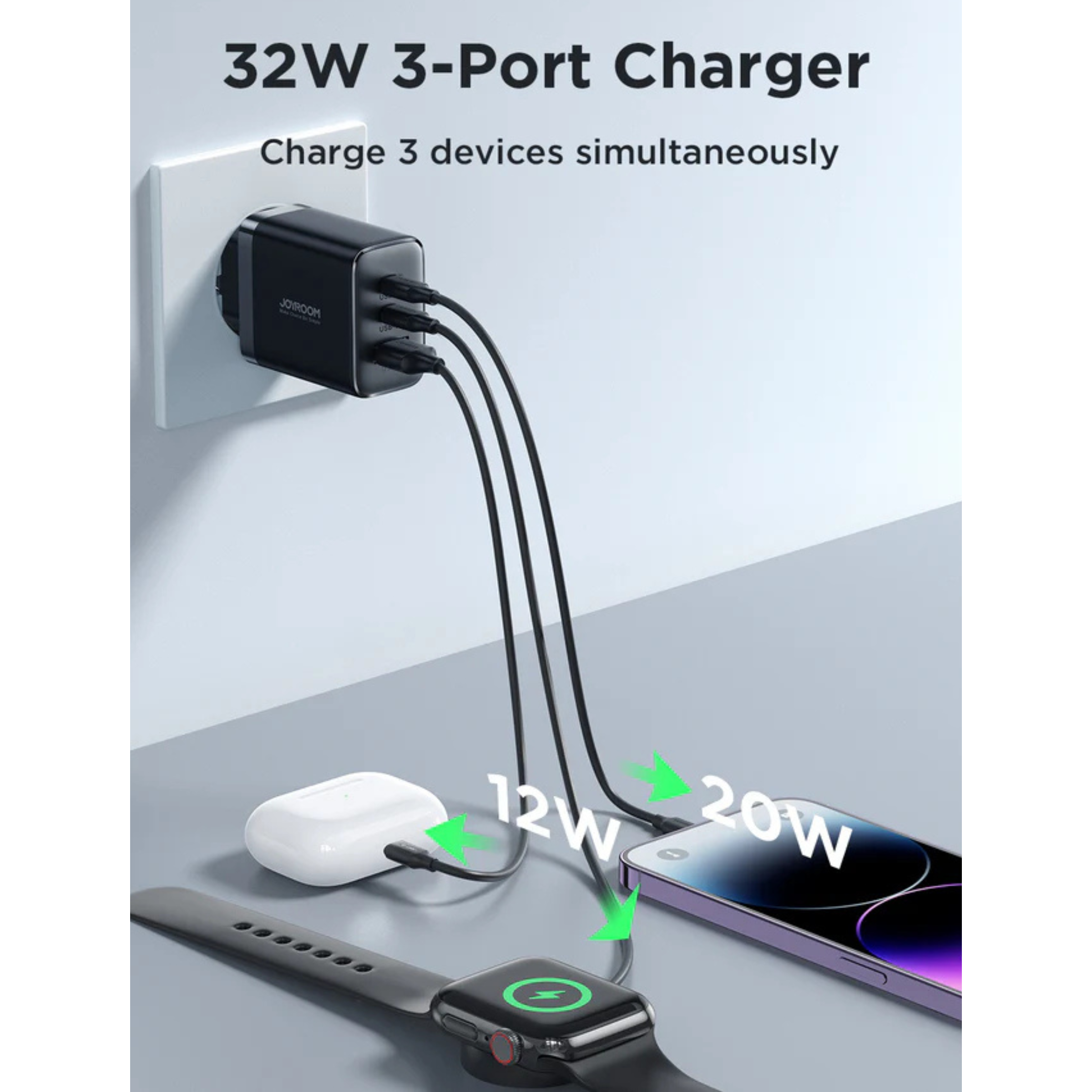 Joyroom JR-TCF10 32W 2C1A Fast Charger – Black(32W হাই-স্পিড আউটপুট | 2C1A মাল্টি-পোর্ট ডিজাইন | স্মার্ট চার্জিং টেকনোলজি | মাল্টি-লেয়ার…