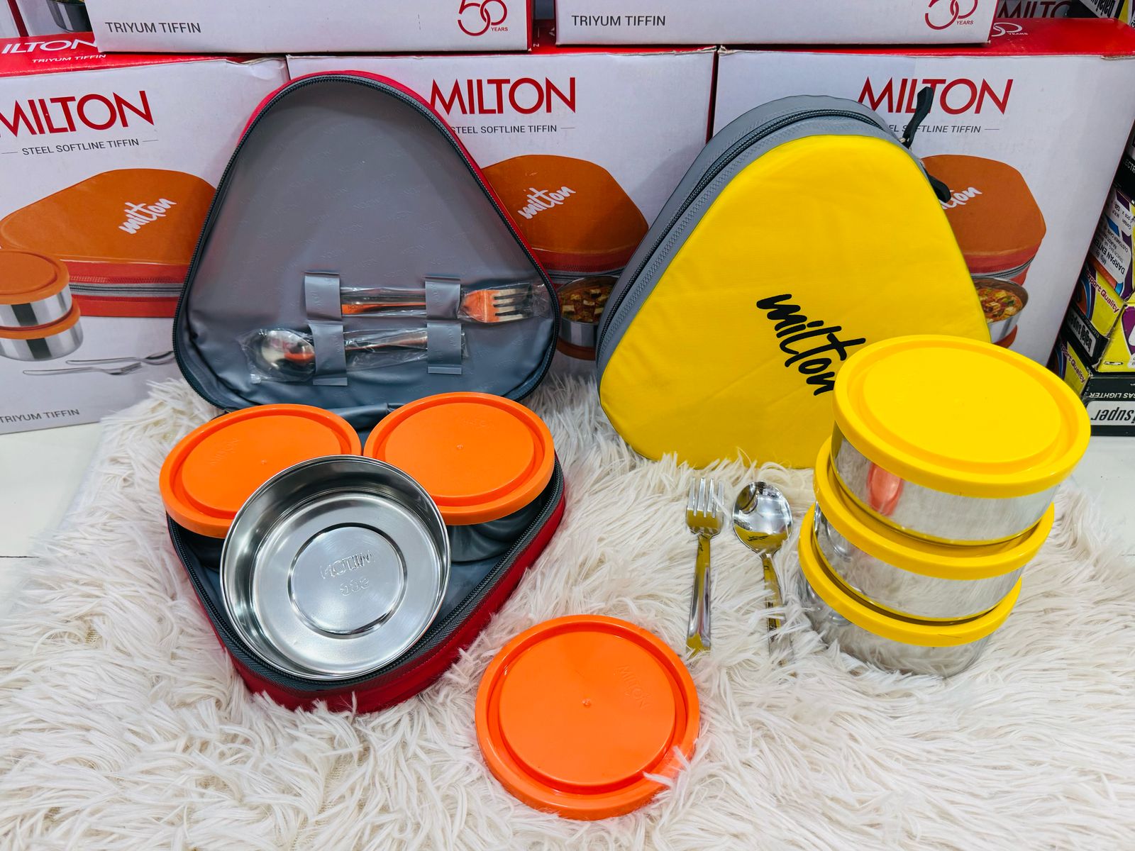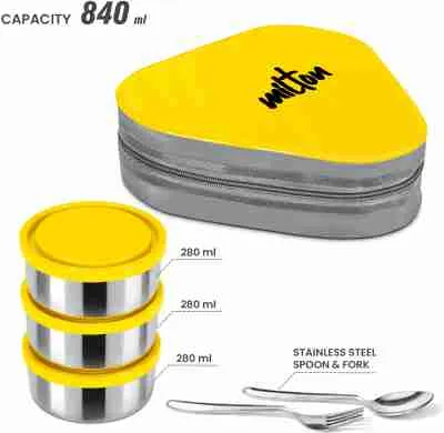 About this itemColor: Green; Material: Stainless Steel; Package Content: 1 – Piece Triyum Tiffin (3 Containers, 280 ml Each)This tiffins are made from stainless steel, which is durable, rust-resistant, and easy to clean. This is also a safe and non-toxic material for storing food. They can withstand regular use and are less prone to breakage.Containers are leak proof which prevents any leakage or spillage during transportation. This helps in keeping the food fresh, prevents mixing of flavors, and allows for better organization.Insulated Jacket keep the food warm or cold for a longer duration. This jacket is easy to maintain and clean.This tiffin is lightweight and portable, making it convenient for carrying to work, school, picnics, or other outings.It comes with tumbler which is 100% Leak Proof with the snap-on lid, making it convenient and hassle-free to carry without any fear of spillage. It has a wide mouth and base which makes it easy to clean.ColourOrange   and YellowMaterialStainless SteelBrandMILTONAge Range (Description)AdultSpecial FeatureLightweightCapacity280 MillilitersThemeFoodPatternSolidProduct Care InstructionsHand Wash OnlyIncluded Components1 – Piece Triyum Tiffin (3 Containers, 280 ml Each)