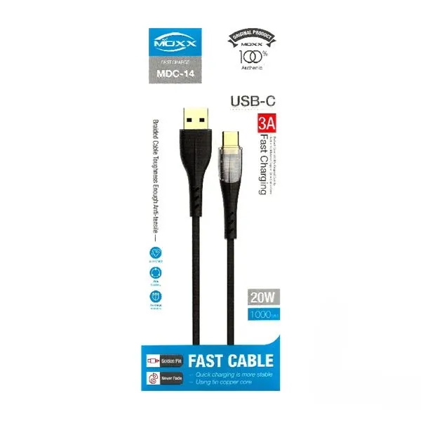 Product details of MOXX USB to Type C 20W fast charging cable (MDC-14)Model:MDC-14Power: 20wInput: USBExportation: Type-CLength: 1mColor: BlackTransmission Rate: 480MbpsMax Output: 3APower: 20wInput: USBExportation: Type-CLength: 1mColor: BlackTransmission Rate: 480MbpsMax Output: 3AMaterial: Golden aluminum alloy + TPE +High density nylon braided wireFunction: Fast charge + Data transmission