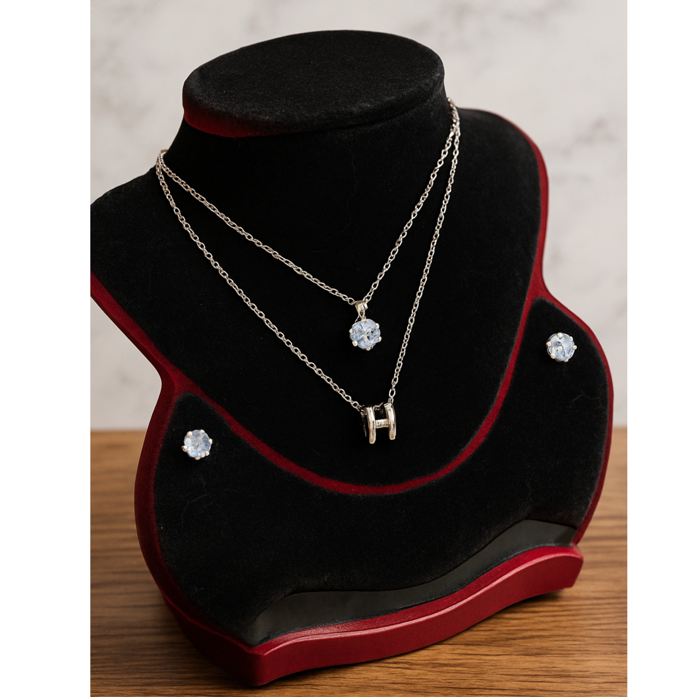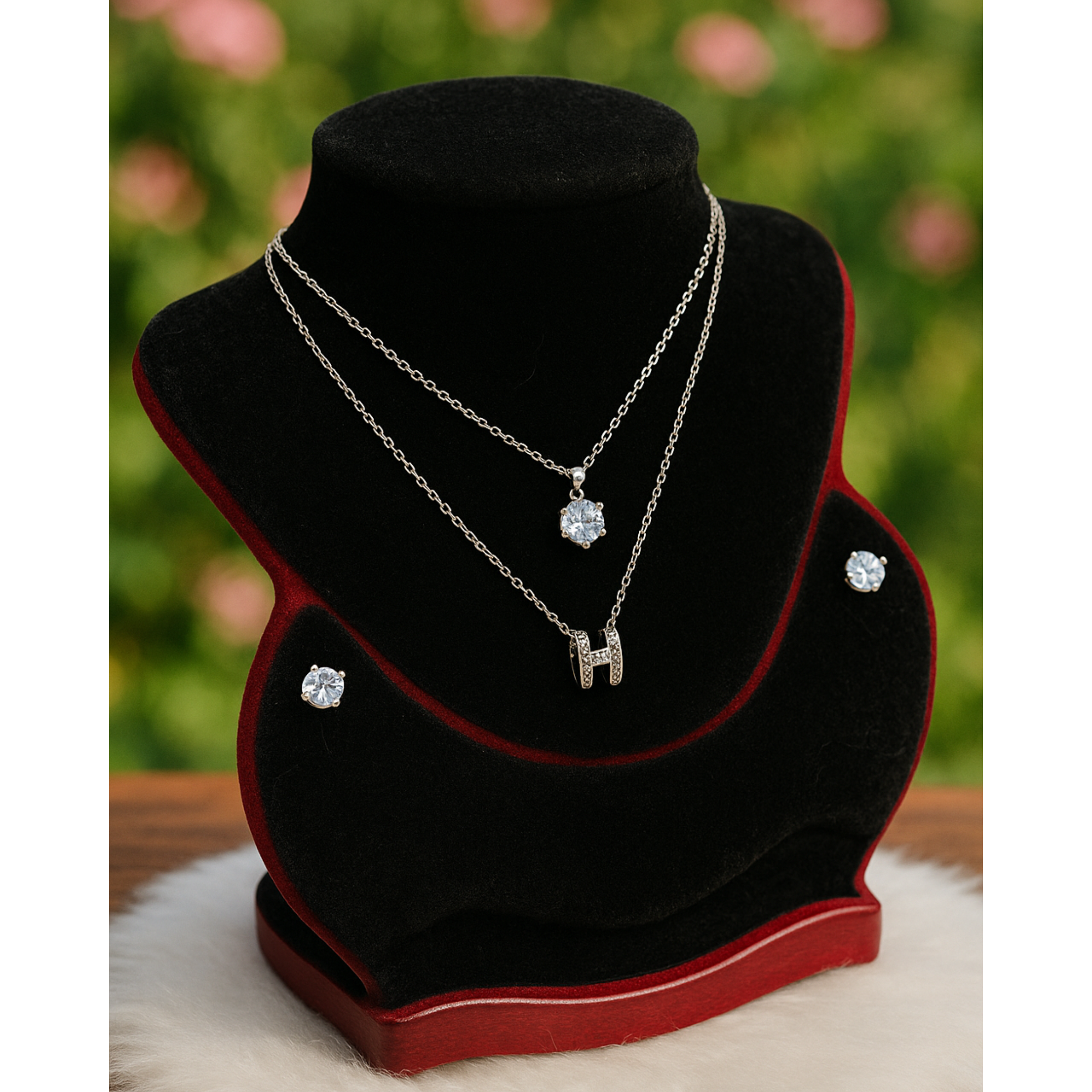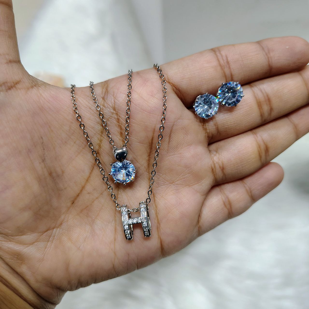অবশ্যই! ✨💎 Necklace With Matching Radiant Crystal Stud Earrings.ছবিতে দেখা যাচ্ছে এক হাতে ধরা দুটি সুন্দর রূপালী রঙের নেকলেস এবং এক জোড়া মানানসই কানের দুল। নেকলেস দুটির মধ্যে একটি তুলনামূলকভাবে ছোট, যার লকেট একটি উজ্জ্বল গোলাকার পাথর বসানো। পাথরটি আলোয় ঝলমল করছে। অন্য নেকলেসটি একটু লম্বা এবং এর লকেটটি দেখতে অনেকটা চোখের পাতার মতো, যার মধ্যে ছোট ছোট অনেকগুলো পাথর বসানো এবং নকশা করা।💎💖কানের দুল দুটিও একই রকম নকশার, ছোট এবং গোলাকার পাথরের। গয়নাগুলোর ধাতব অংশ রূপালী রঙের এবং পাথরগুলো স্বচ্ছ, যা তাদের সৌন্দর্য আরও বাড়িয়ে তুলেছে।💎🌸 এগুলো যেকোনো অনুষ্ঠানে পরার জন্য উপযুক্ত এবং আপনার সাজে যোগ করবে এক নতুন ঔজ্জ্বল্য।✨👰♀️💍 এই গয়না সেটটি যেমন সুন্দর তেমনি আধুনিক, যা সহজেই সবার দৃষ্টি আকর্ষণ করতে সক্ষম।🎁🎀