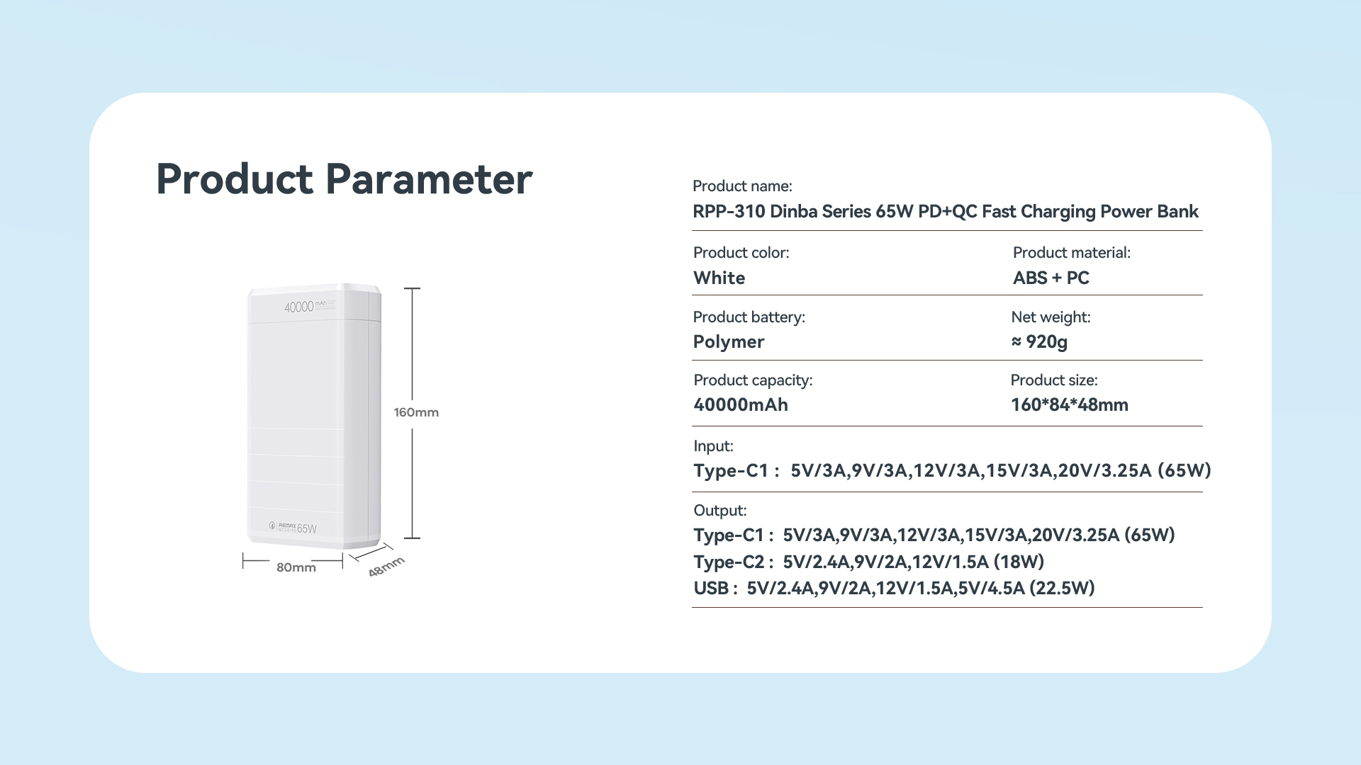 Remax RPP-310 Dinba Series 65W PD+QC Fast Charging Power Bank Product color: White Product battery: Li-Polymer Battery Product material: ABS + PC Net weight: ≈ 920g Product capacity: 40000mAh/148Wh/3.7VRated capacity: 21600mAh 5V=3A Product size: 160*84*48mmInput: Type-C1: 5V/3A,9V/3A,12V/3A,15V/3A,20V/3.25A (65W)Output: Type-C1: 5V/3A,9V/3A,12V/3A,15V/3A,20V/3.25A (65W)